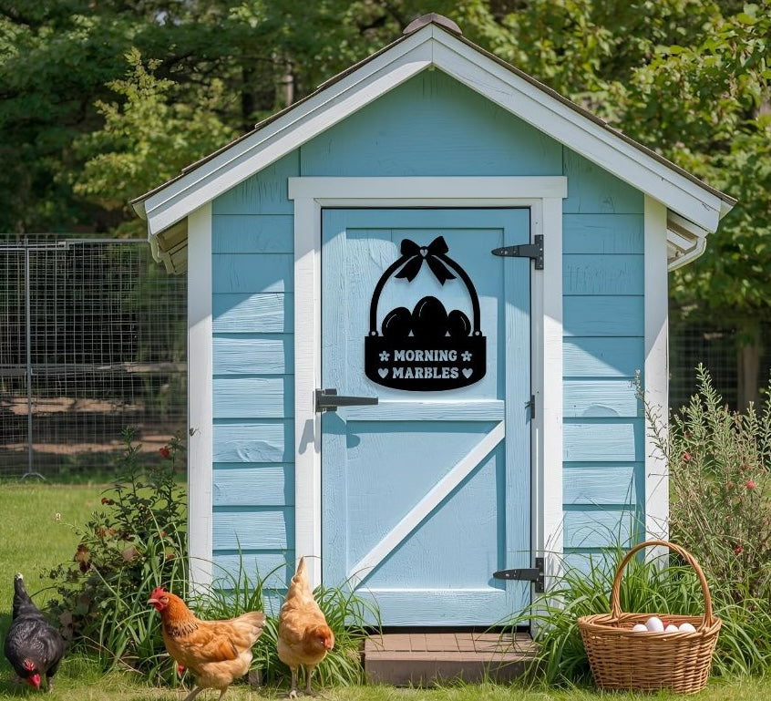 Add a dash of humor and homestead charm with this sweet metal sign featuring a cozy basket of eggs and playful text adorned with dainty flowers and hearts.
