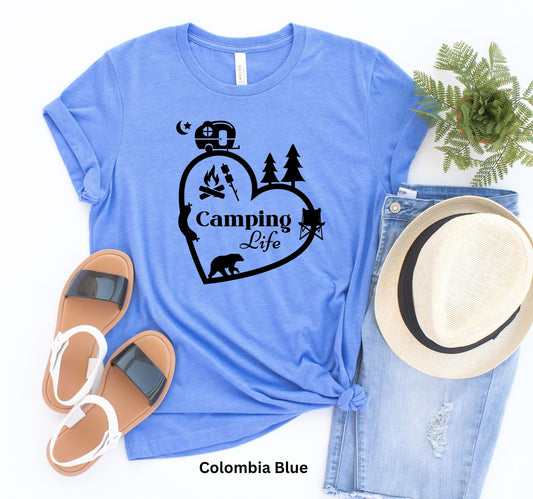 Camping Life Heart T-Shirt - Teardrop Travel Trailer & Campfire Adventure Tee