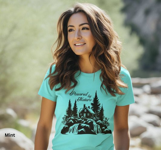 Powered by Nature T-Shirt - Cabin & Waterfall Tee - Nature Lover Shirt