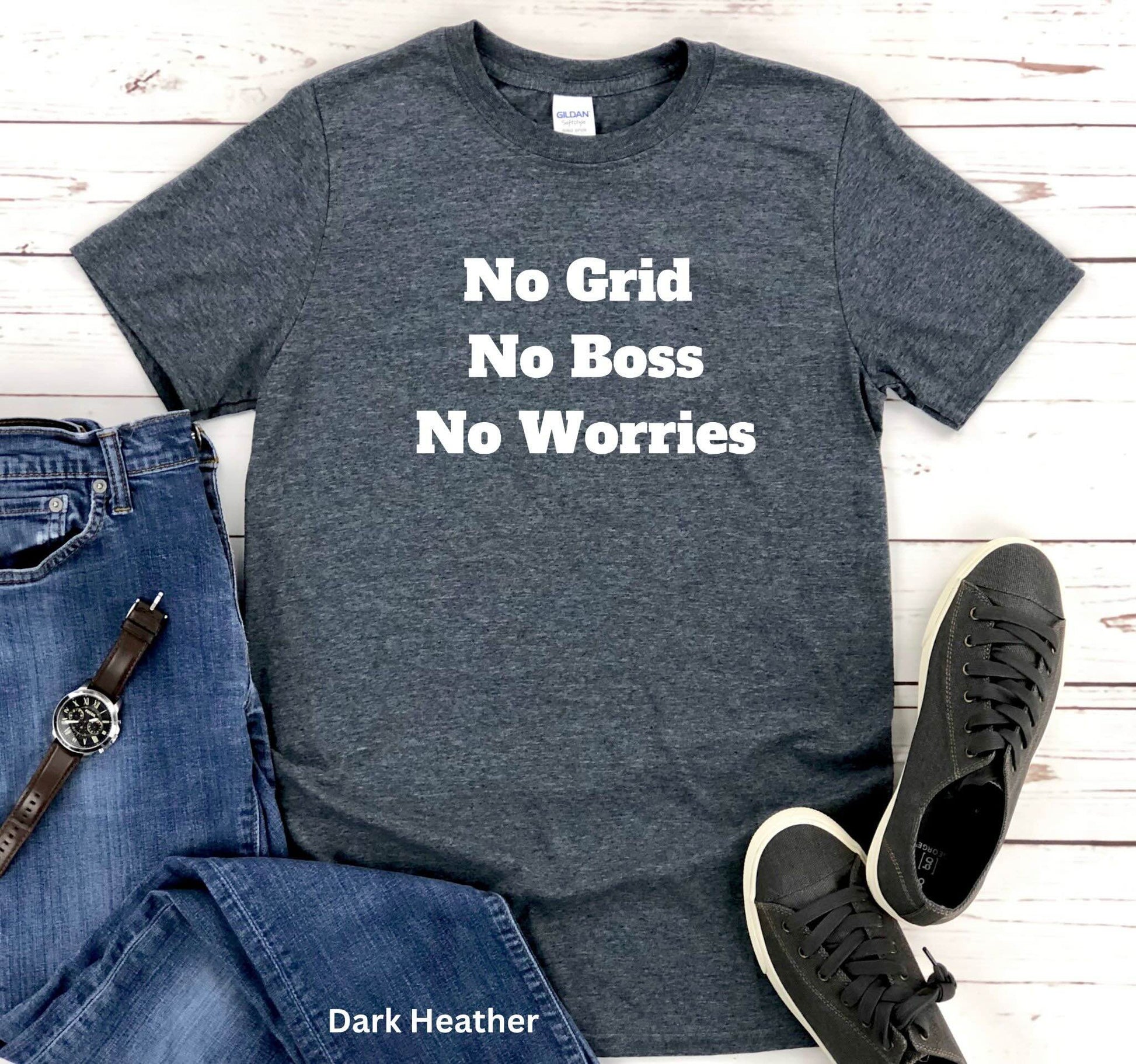 No Grid No Boss No Worries T-Shirt - Off Grid Self Sufficiency Freedom Shirt